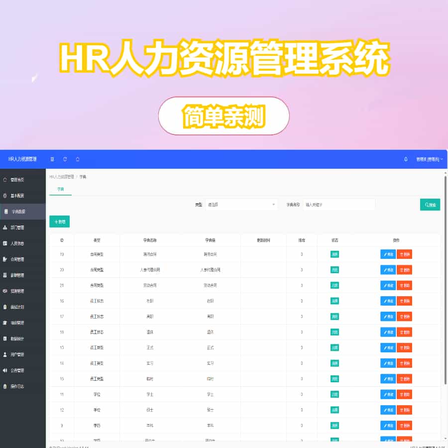 非常全面的一款HR人力资源系统,后台可以管理合同、薪资、员工、部门、招聘、面试、培训、数据统计等等