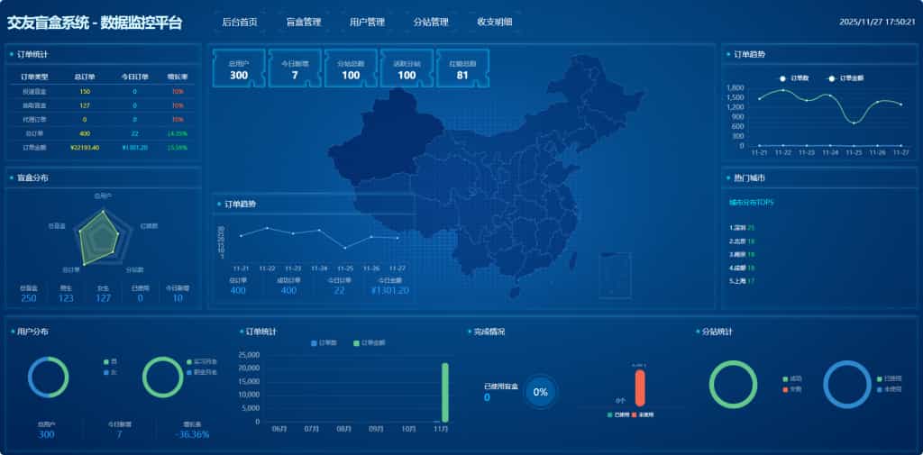 数据大屏:用户、订单、盲盒数量一目了然,连趋势图都给你画好了。