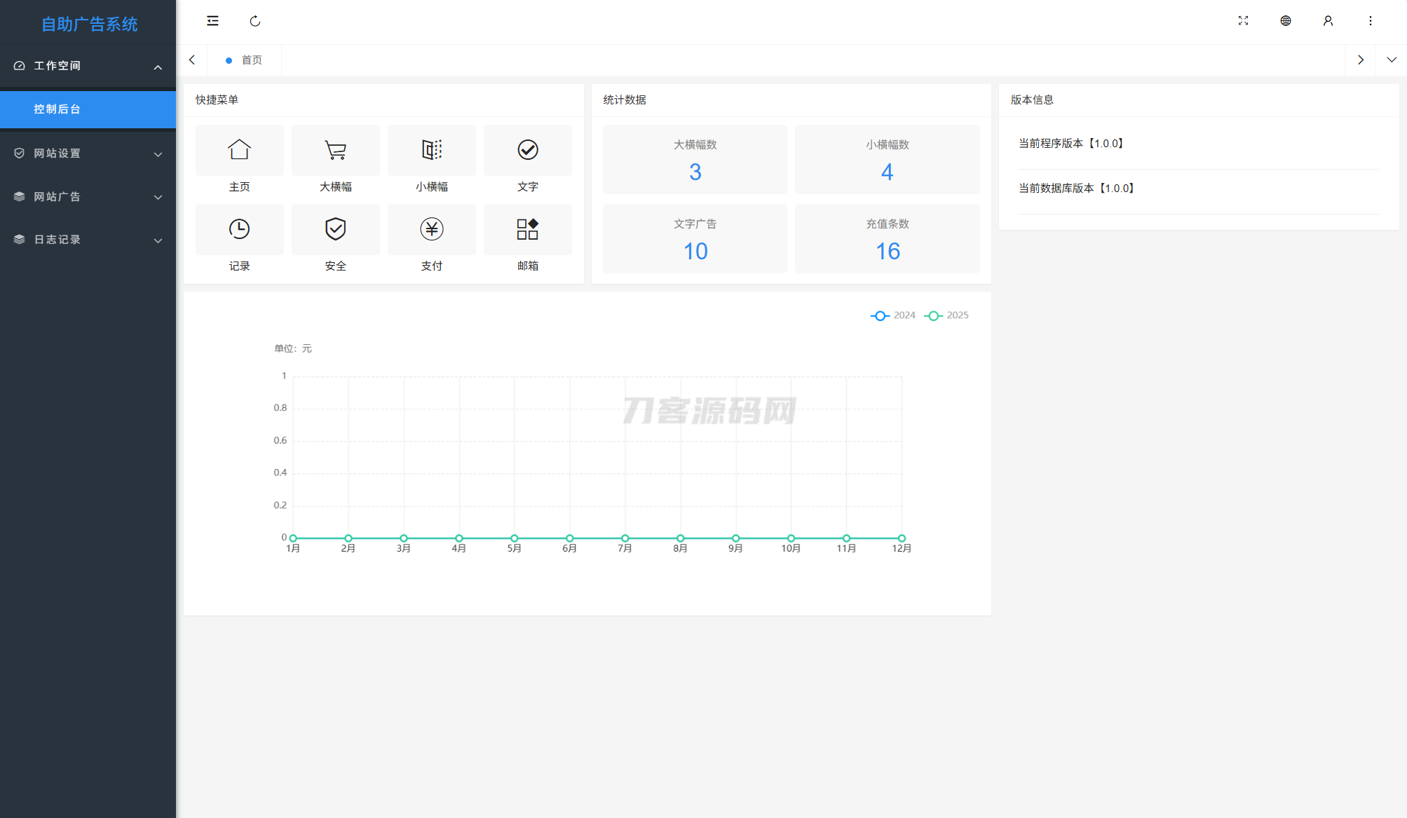 自助购买大横幅,小横幅,文字广告,后台可设置每个广告位的不同价格,颜色,宽高,自由增加修改广告位数量