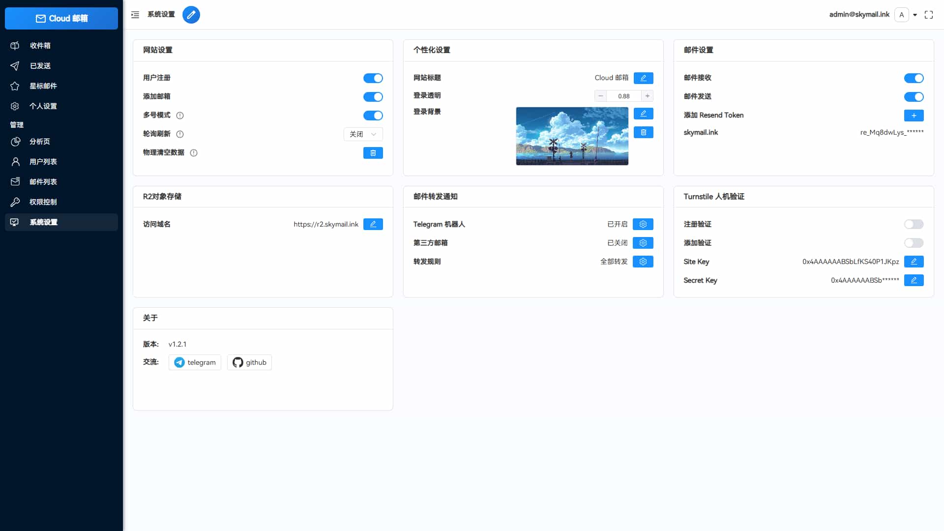 这是一款Email邮箱服务系统,并且支持邮件发送TG转发只需要一个域名,就可以创建多个不同的邮箱,类似各大邮箱平台 QQ邮箱,谷歌邮箱等,本项目使用Cloudflare部署,Resend推送邮件,无需服务器费用,搭建自己的邮箱服务。
